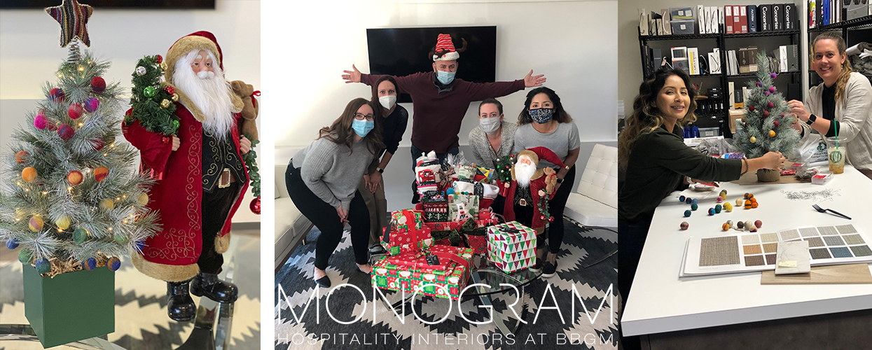 MONOGRAM at BBGM designers loved being able to partner again with UMOM New Day Center in Phoenix to give back to the community in a couple different ways this year. Dal-Tile 2nd Annual Designer Tree Trimming supports UMOM’s at risk and homeless youth living in shelters this holiday season. For our tree design we were inspired by a rainbow theme, and incorporated string lights. We covered our star tree-topper with a multi-color fabric sample, and lined it with decorative twine. Our second opportunity to participate in UMOM’s community was the Adopt-A-Family Stocking. It was so fun to wrap gifts